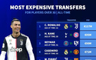 德转统计30岁以上球员转会费榜:C罗居首,凯恩内马尔分列二三