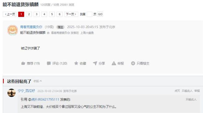 特别是和广厦男篮的比赛,张镇麟全场仅得到7分。他在这场比赛多次持球想当持球大核,还多次持球杀入篮下,但整体得分表现很一般,成功率很差,过去两场热身赛累计得到14分,这个表现也远低于球迷预期。甚至不少上海男篮球迷在社交媒体吐槽喊话:能不能把张镇麟退回辽篮?我们被“诈骗”了。