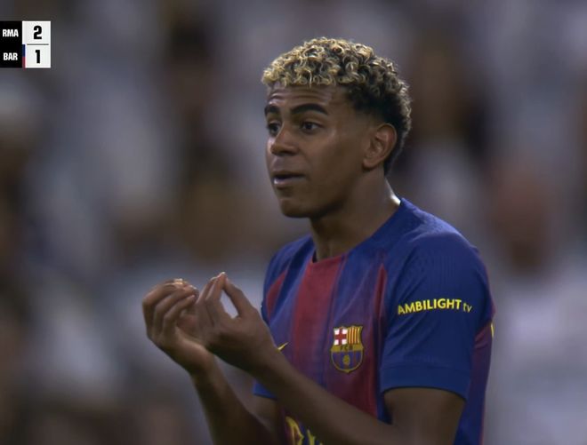 第38分钟,居莱尔在后场处理球不干脆,在弧顶区域丢失球权,巴萨组织快速进攻,拉什福德在左路将球传至中路,费尔明跟进推射破门,两队重回同一起跑线。上半场结束前,米利唐头球助攻贝林厄姆推空门进球,贝林完成一传一射,助皇马2-1领先,姆巴佩进球再次因为越位被吹。在下半场比赛中,开场没多久贝林厄姆制造了加西亚手球犯规,皇马获得点球机会,姆巴佩主罚被什琴斯尼神勇扑出,皇马无缘扩大比分。