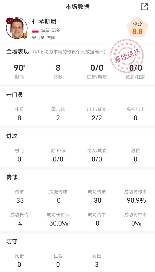 雷速体育10月27日讯 在今天凌晨结束的巴萨客场1-2不敌皇马的西班牙国家德比中,什琴斯尼高接低挡奉献了8次扑救。